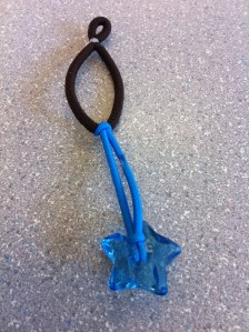 1. Make an elastic pencil holder (as you can see, I made this one out of a black and a blue hair elastic, a big star bead and a small zip tie).