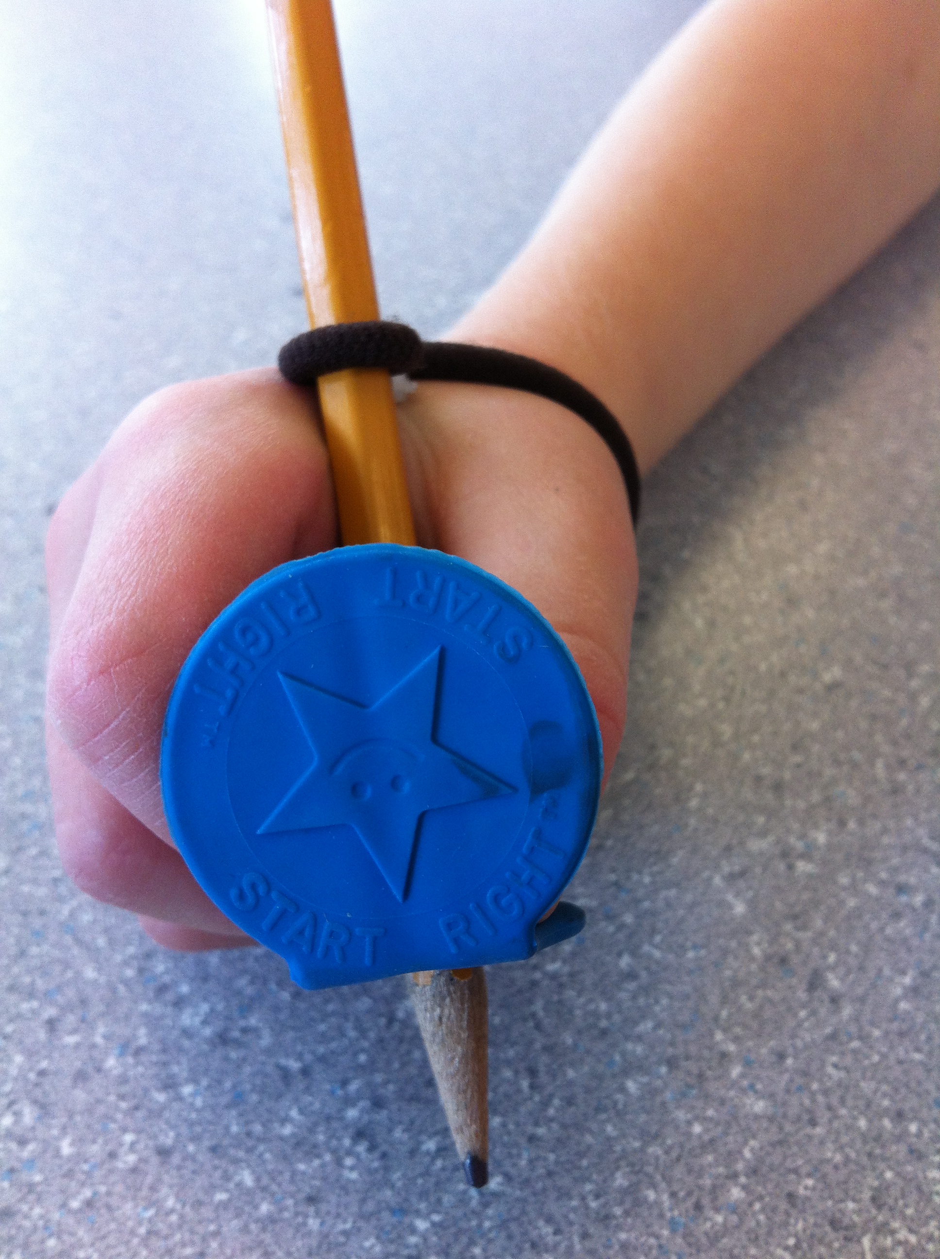 5. For most pencil fisters (or students who use too many fingers to stabilize their pencil), the pencil will often lean forward when they try using only their thumb and pointer to hold it. To fix this, simply thread the un-sharpened end of the pencil through the small loop you created in the black elastic. The pencil will be tilted back and held in the web space between the thumb and pointer.